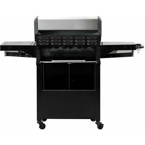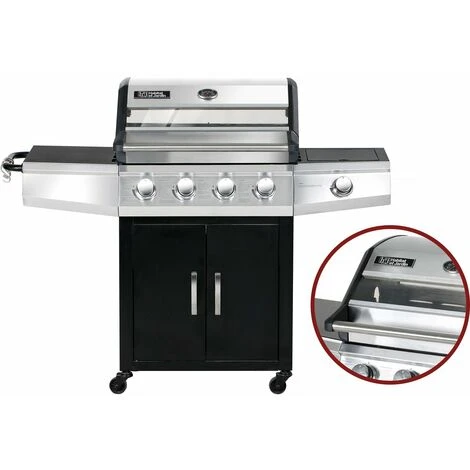 Descriptif : Barbecue gaz 4+1 brûleurs – couvercle avec fenêtre en verre – Une puissance de 15.2 kW – 4 Brûleurs de 11.7 kW et 1 brûleurs latérale de 3.5 kW- Largeur des tablettes latérales : 34 cm – Récupérateur de graisse amovible – 3 Crochets pour suspendre vos ustensiles Ce modèle est équipé d’une tétine gaz. : Vous avez besoin d’un tuyau de gaz et d’un détendeur conforme, selon votre type de bouteille et de gaz. .