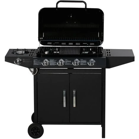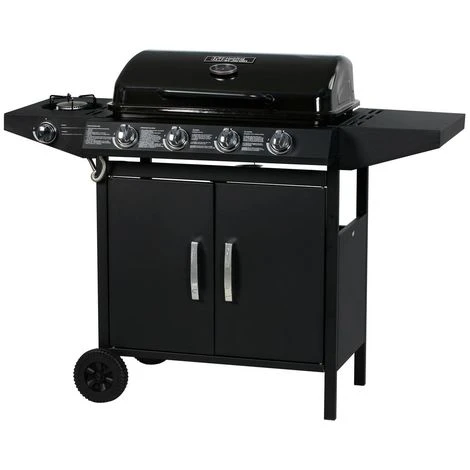 Enfin, vous pourrez le recouvrir (une fois propre, refroidi et sec) d’une housse de protection et l’entreposer dans un endroit protégé en cas d’intempéries ou lorsque vous ne l’utilisez plus. Descriptif : Barbecue gaz 5 brûleurs 9.6 kW – Dont 1 brûleur latéral 3.3 kW – Surface de cuisson : 64 x 37 cm – Structure en acier – Grilles acier émaillé – Plaque cuisson fonte – Bac récupérateur de graisse amovible – 2 roues de déplacement – Tuyau et détendeur non fournis Grille : 36 x 21.5 cm Plancha : 35 x 19 cm Tablette latérale: 36 x 27 cm Gaz butane Ce modèle est équipé d’une tétine gaz. : Vous avez besoin d’un tuyau de gaz et d’un détendeur conforme, selon votre type de bouteille et de gaz. Ne pas raccorder sur le gaz domestique. Respecter la date de validité inscrite sur le flexible .