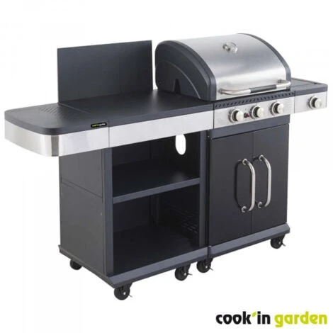 Le barbecue au gaz est composé d’une partie grille et d’une autre plancha pour vous permettre de cuire simultanément vos viandes, légumes ou poissons. Mais ce n’est pas tout : il dispose aussi d’un réchaud latéral pour maintenir vos plats à température et de 3 brûleurs, équipés d’un allumage par piezo intégré pour une puissance de 11,5Kw. Enfin, il possède également un capot avec thermomètre intégré, 4 roues multidirectionnelles et un caisse double porte pour ranger votre bouteille de gaz ou vos accessoires.