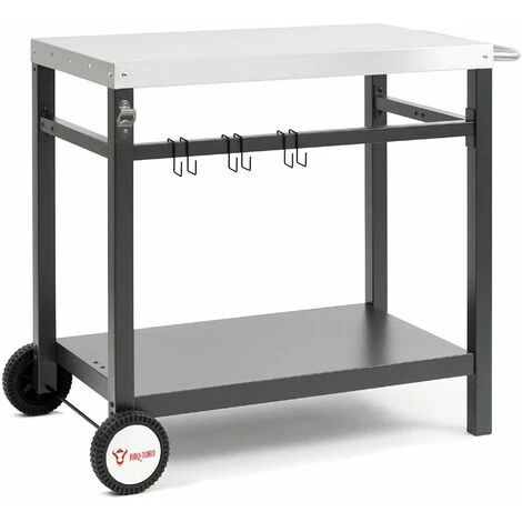Le chariot de barbecue BBQ-Toro est polyvalent et peut également servir de table d´appoint. Préparez vos aliments directement sur le grill. Le chariot latéral est facile à déplacer car il possède deux roues en plus de la grande poignée. En outre, la table de barbecue est équipée d´un décapsuleur, de crochets pour les couverts de barbecue et d´une tablette inférieure.
