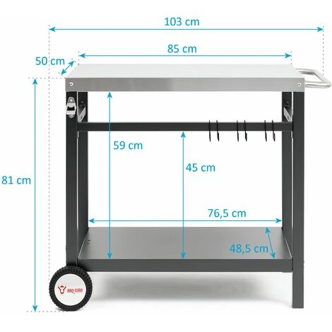 Le chariot de barbecue ne sert pas seulement de lieu de stockage pour vos ustensiles de barbecue, mais grâce à sa taille parfaite, il est aussi parfaitement adapté comme table de préparation pour vos repas au barbecue. La table de barbecue est dotée d´un plan de travail en acier inoxydable. Le cadre de base est en acier peint. La taille de la table d´appoint est de (L) 85 x (P) 50 x (H) 81 cm. Le plan de travail mesure (L) 85 x (P) 50 cm et la hauteur de la table de barbecue est de 81 cm. L´étagère inférieure a les dimensions (L) 76,5 x (P) 48,5 cm.