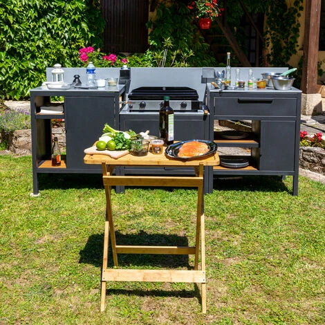 Cuisine d’extérieur avec plan de travail et crédence en acier laqué