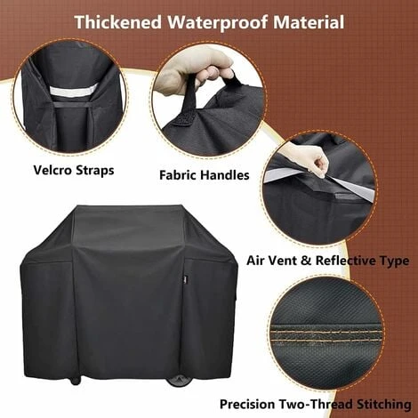 ✔ Ventilation: Trous d’aération spéciaux permettant à l’air de passer à travers le gril tout en utilisant notre housse. Il va accélérer le processus de refroidissement et garder votre barbecue au sec. Et il rendra notre produit plus résistant au vent.
