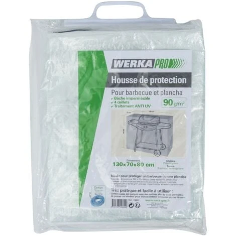 Description détaillée du produit: – produit: housse de protection – marque: Werkapro – utilisation: protection mobilier de jardin – utilisation: protection plancha et barbecue – matière: polyéthylène – dimensions totales: 130 x 70 x 80 cm – grammage: 90 g/m2 – couleur: translucide – forme: rectangulaire – caractéristique: étanche – caractéristique: imputrescible – caractéristique: traité anti UV Housse avec oeillets en aluminium et un cordon pour maintenir la housse. Dimensions et poids, tolérance 5%