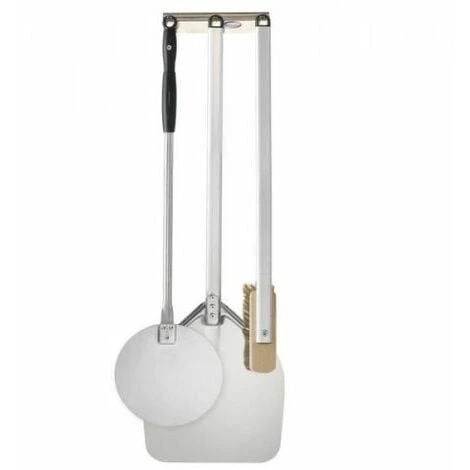 Set de 4 pcs pour pizza maison en acier inoxydable, Made in Italy, Qualité Professionnelle.COMPOSITION : – Pelle à cuire 30 x 30 cm, longueur 90 cm.- Pelle à tourner et sortir du four, diamètre 20 cm, longueur 90 cm – Brosse à poils en laiton réglables, longueur 90 cm – Support de pelle à 3 emplacements du mur, idéal pour ranger les outils.